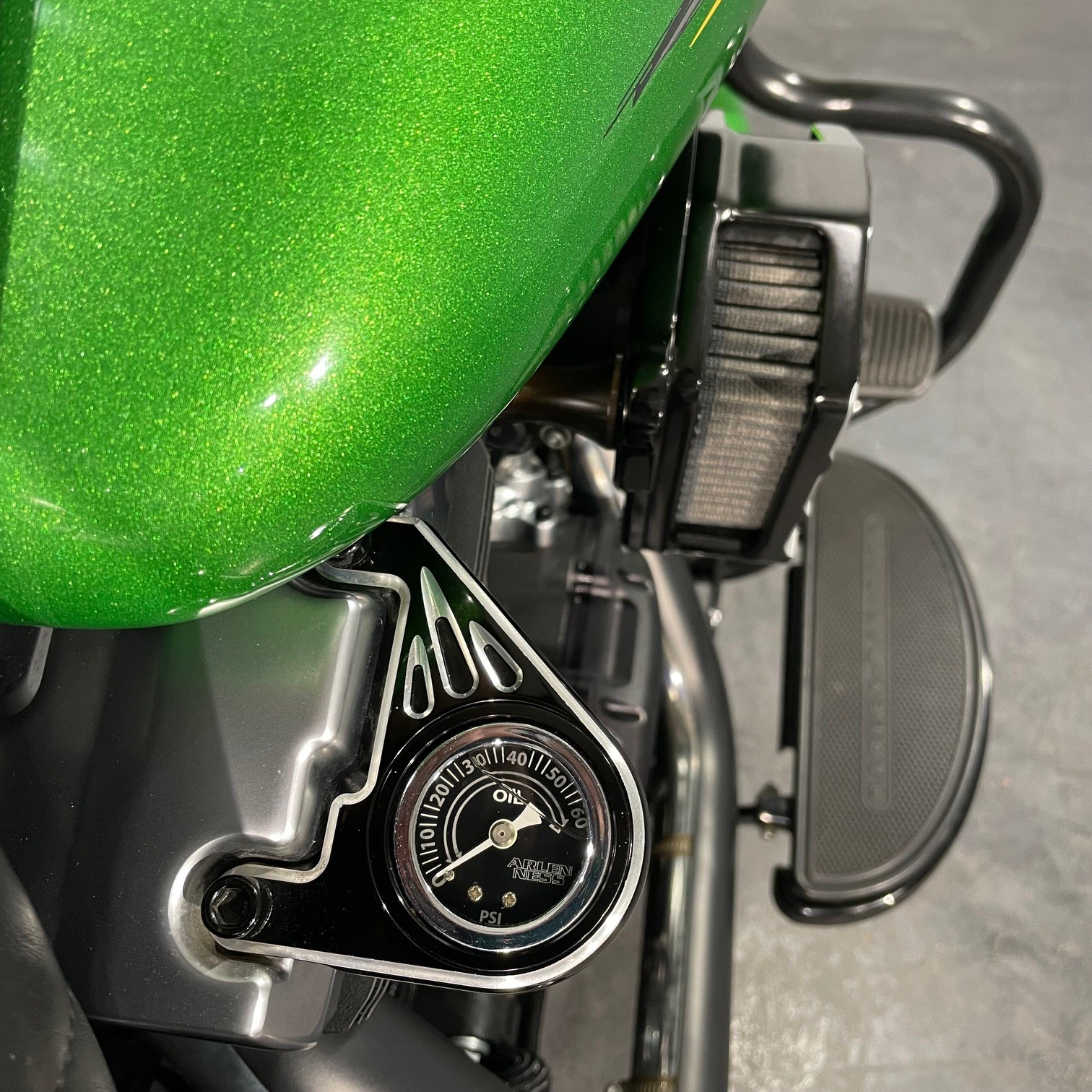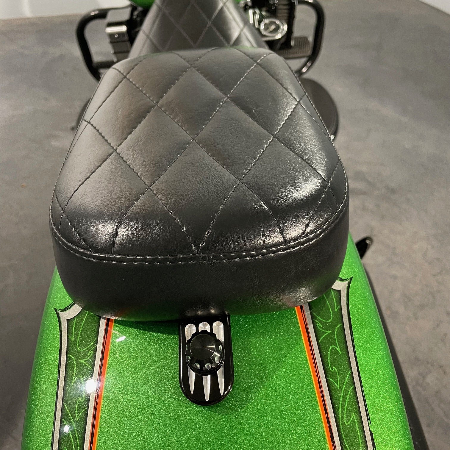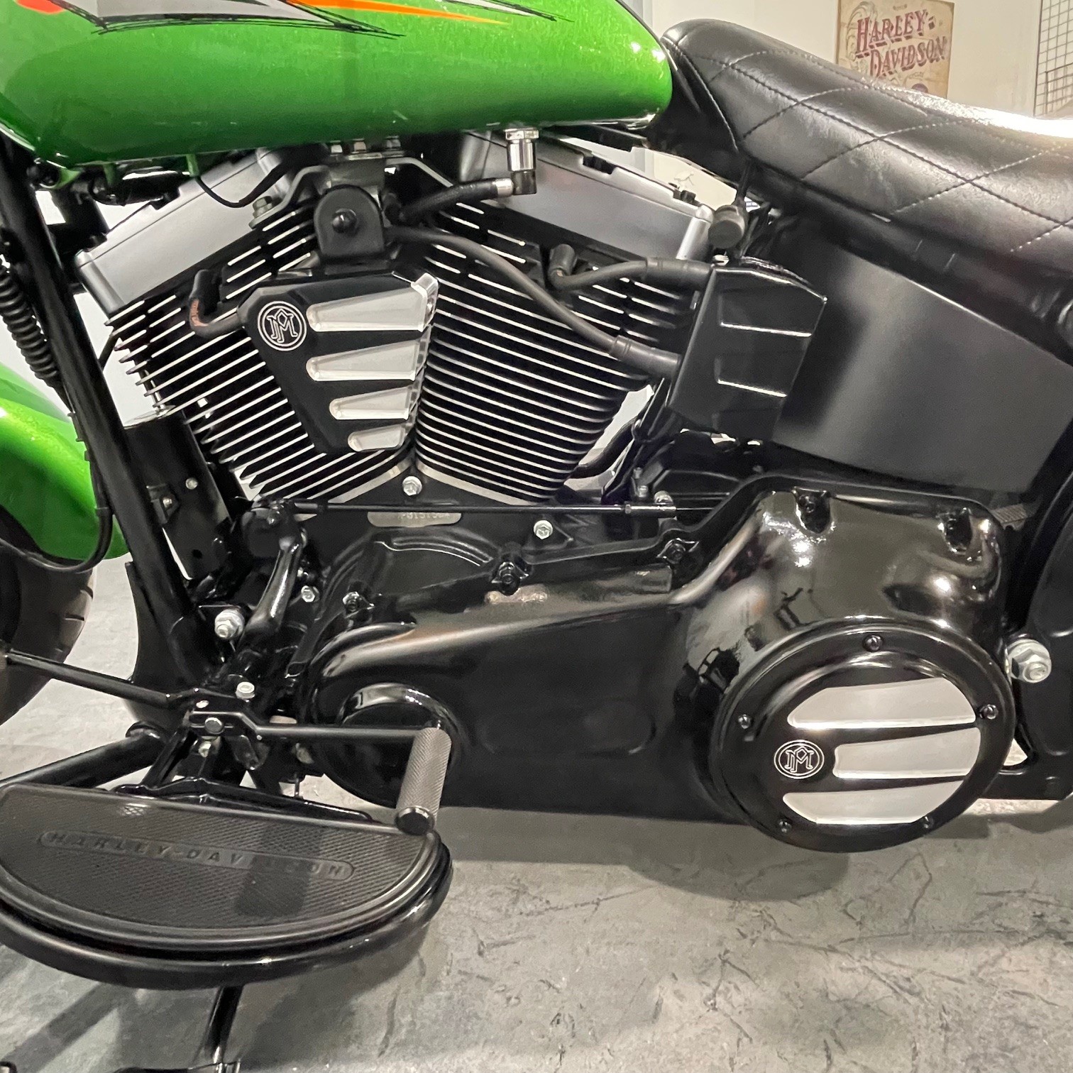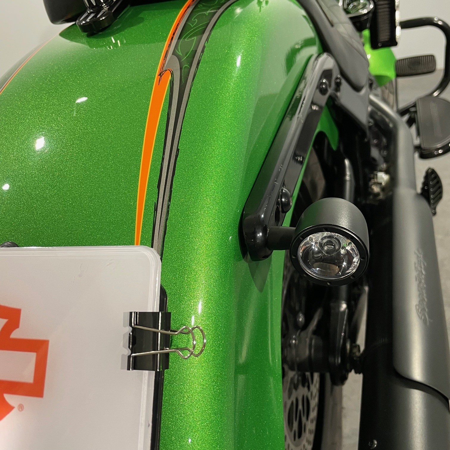 - Accessoires : Nacelle de phare TGV avec phare à Led, mini ape, poignées et bouchons d'axe de roue avant Arlen Ness, compteur Dakota Digital, mini clignotant LED AV+AR, selle pilote et passager Le Pera, cache Klaxon, filtre à air, étriers + disques, manomètre de température d'huile, pots Screamin Eagle, Stage 2, pare jambe moustache