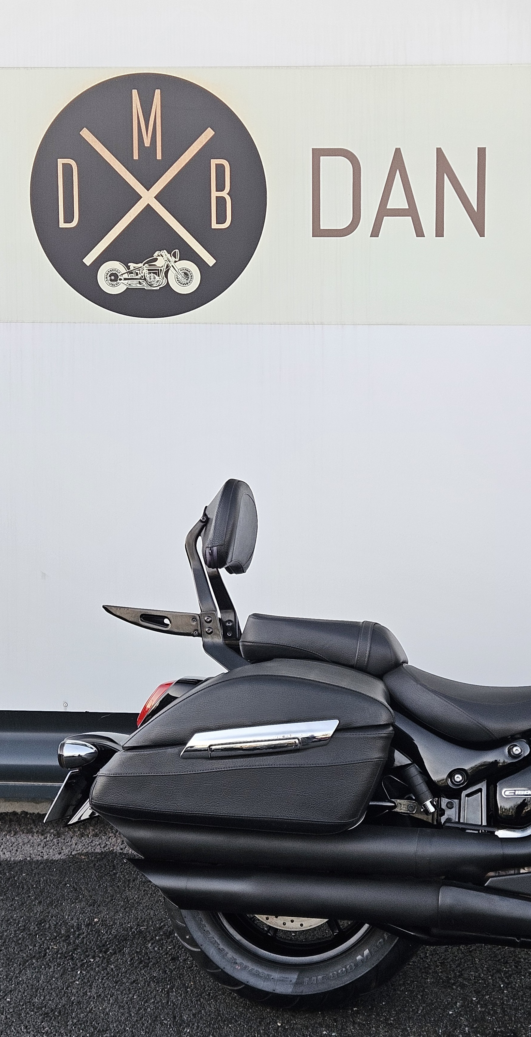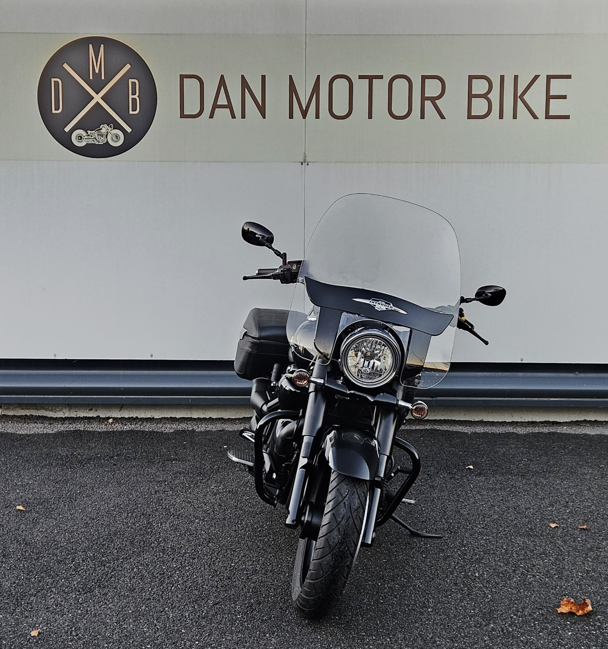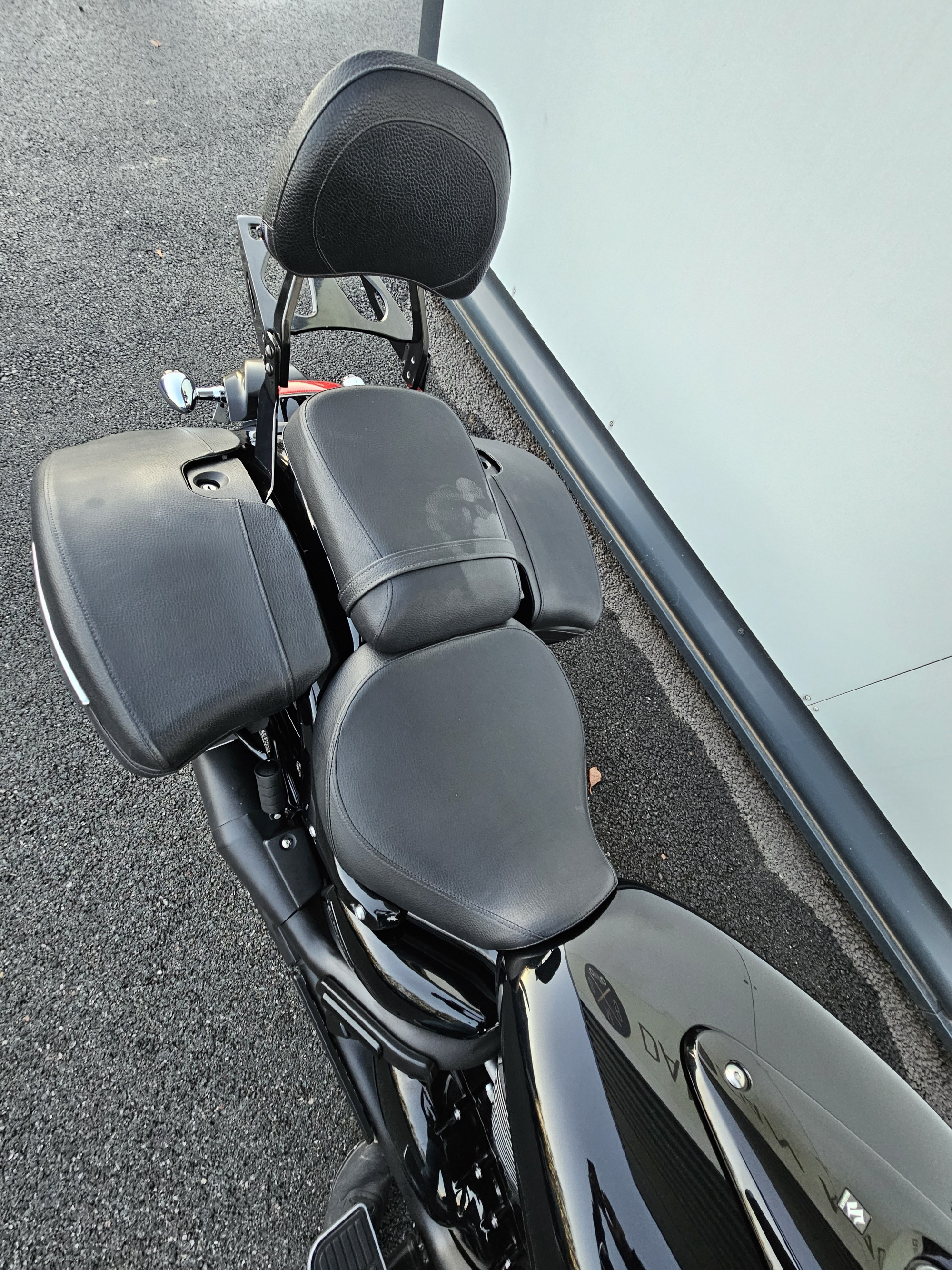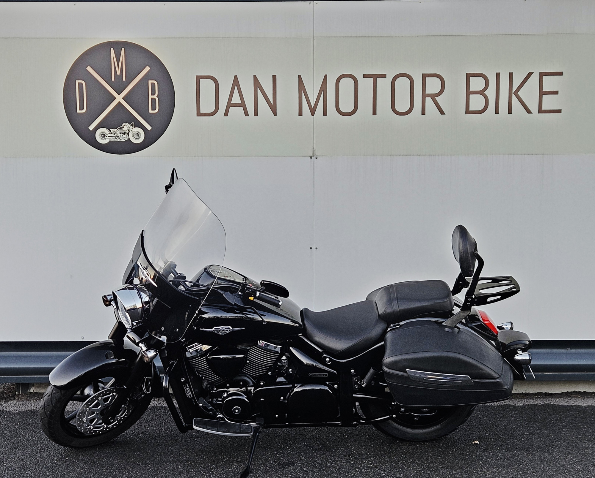 Pare brise haut , pare carter , plateaux marche pied , valises cuir , sissy bar + porte paquet , full black.