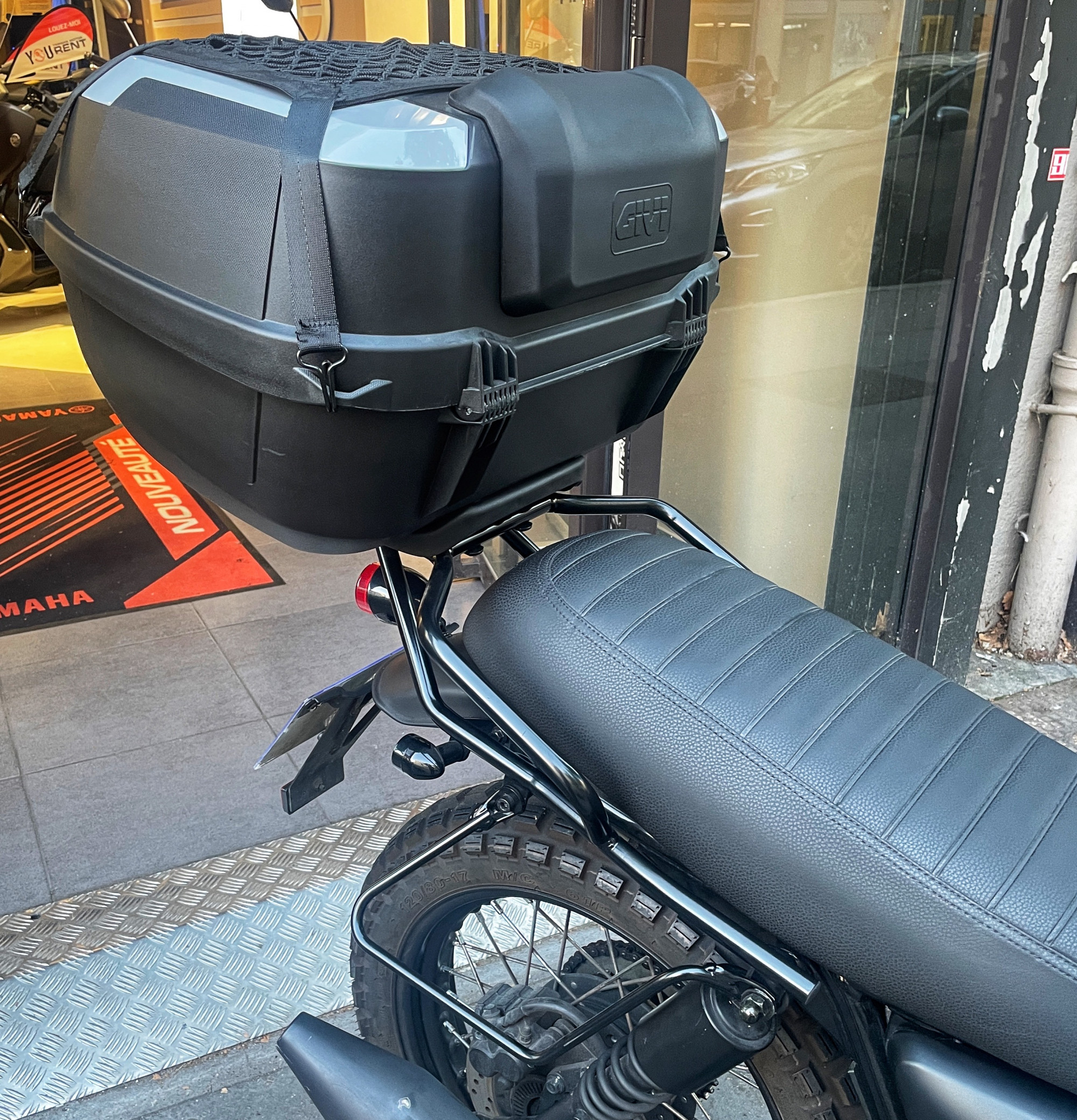 Accessoires en option: Saute vent, Grille de phare, porte bagages et top case avec dosseret, support valises (moto livré avec valise souple GIVI).