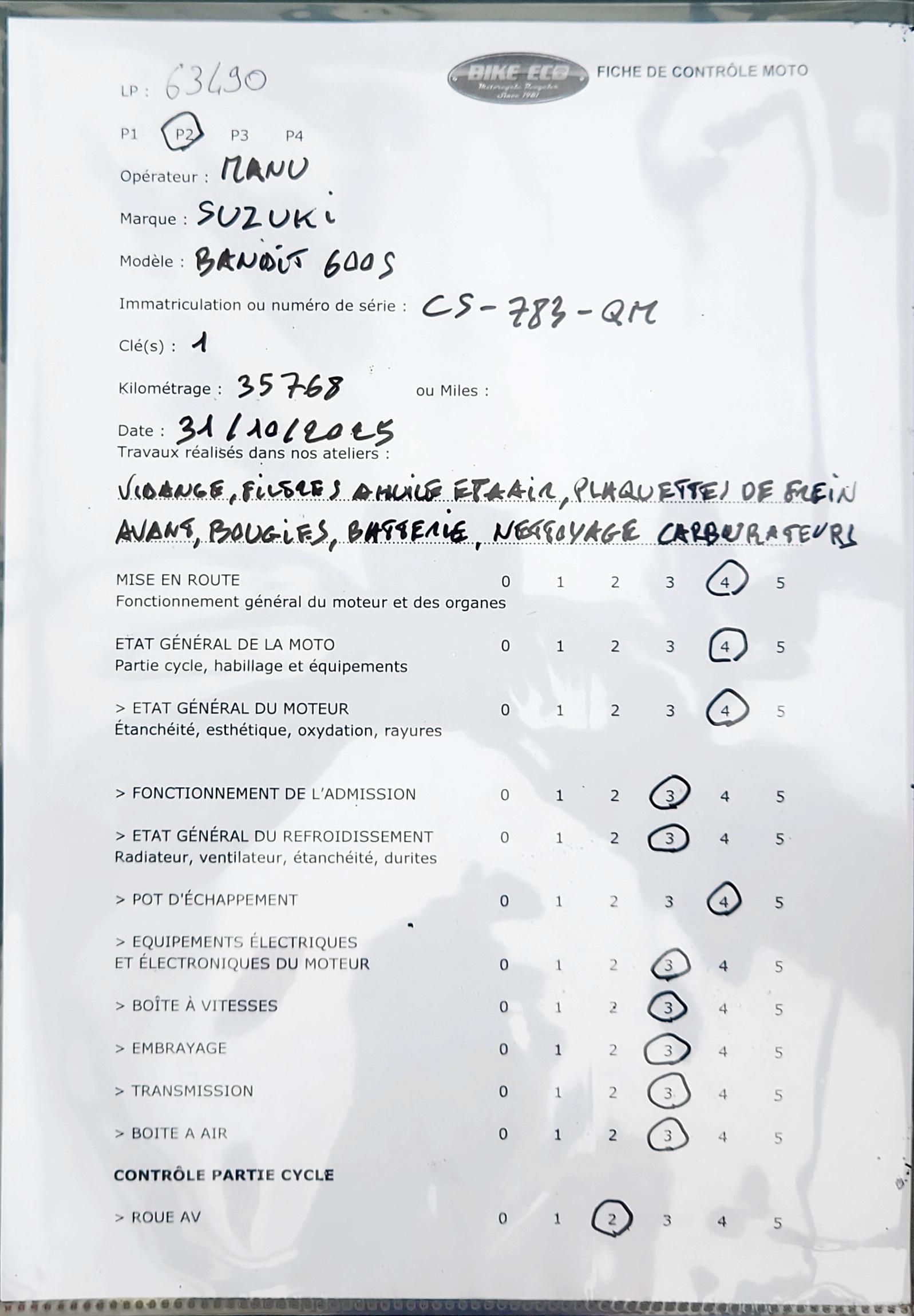Vidange moteur, révision de la rampe de carburateurs, filtre à huile, filtre à air, bougies, batterie et plaquettes de frein avant remplacées.