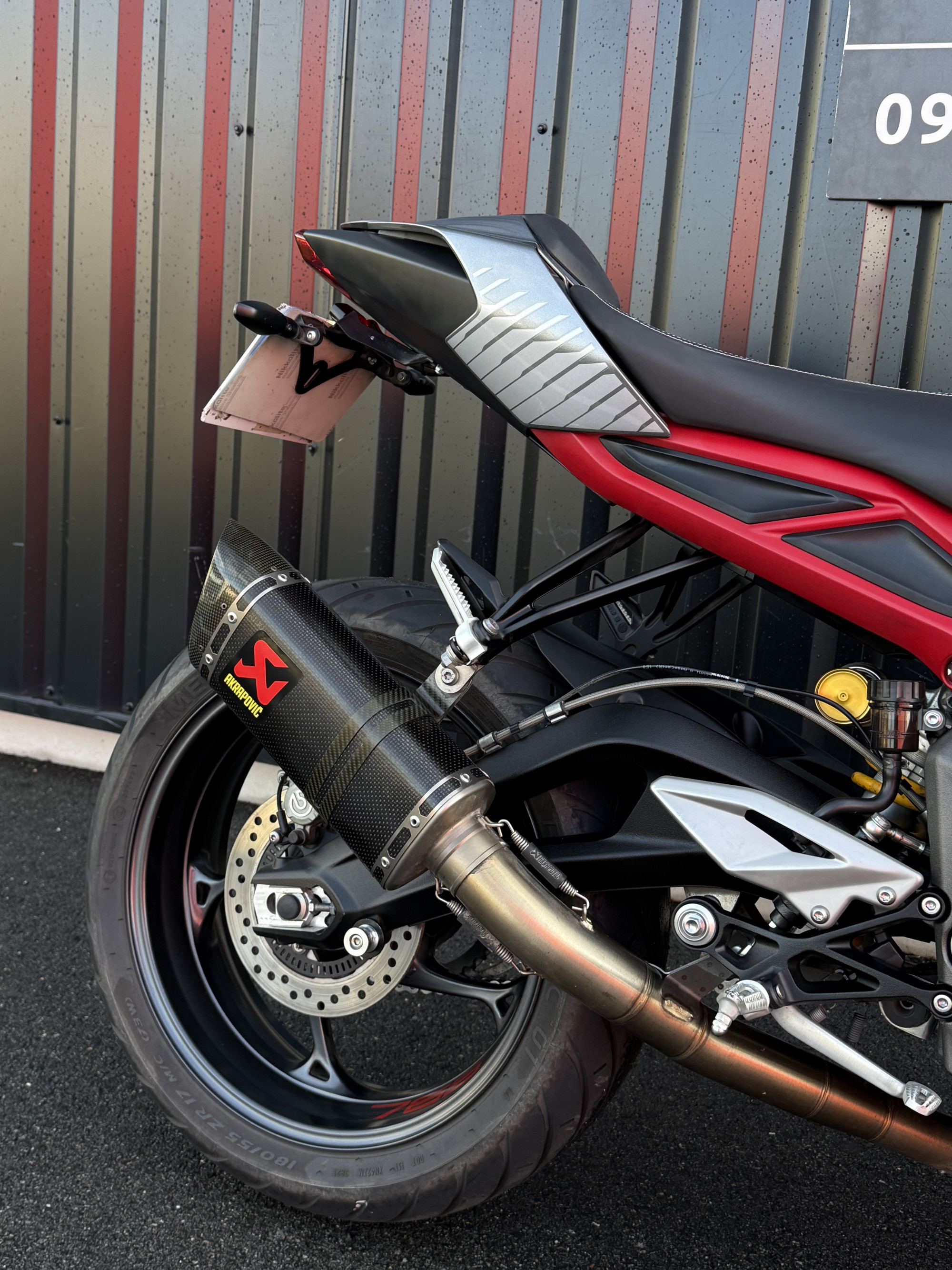 Equipée d'une ligne complète Akrapovic, d'un support de plaque court, de rétro embout de guidon et d'un capot de selle.