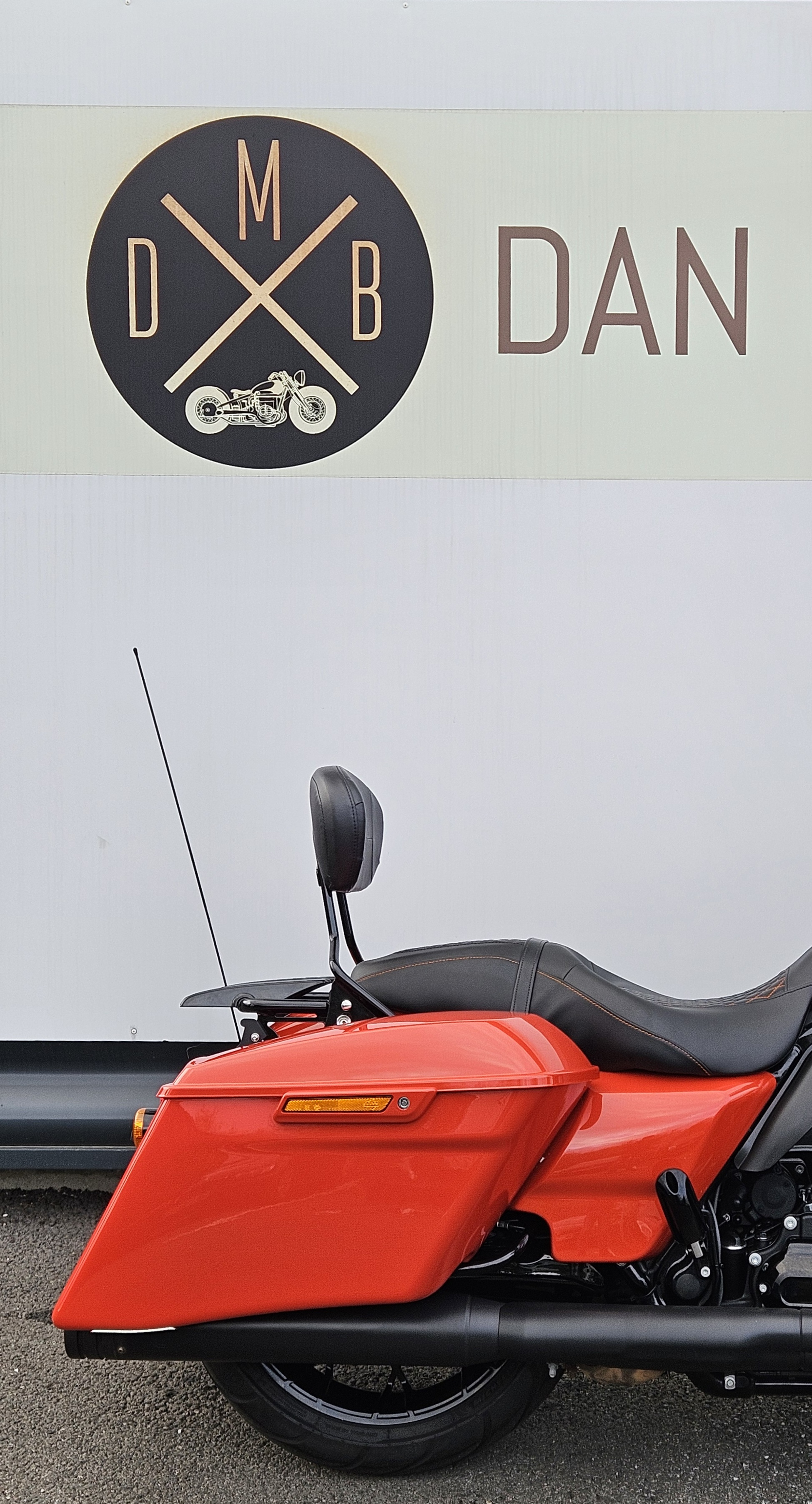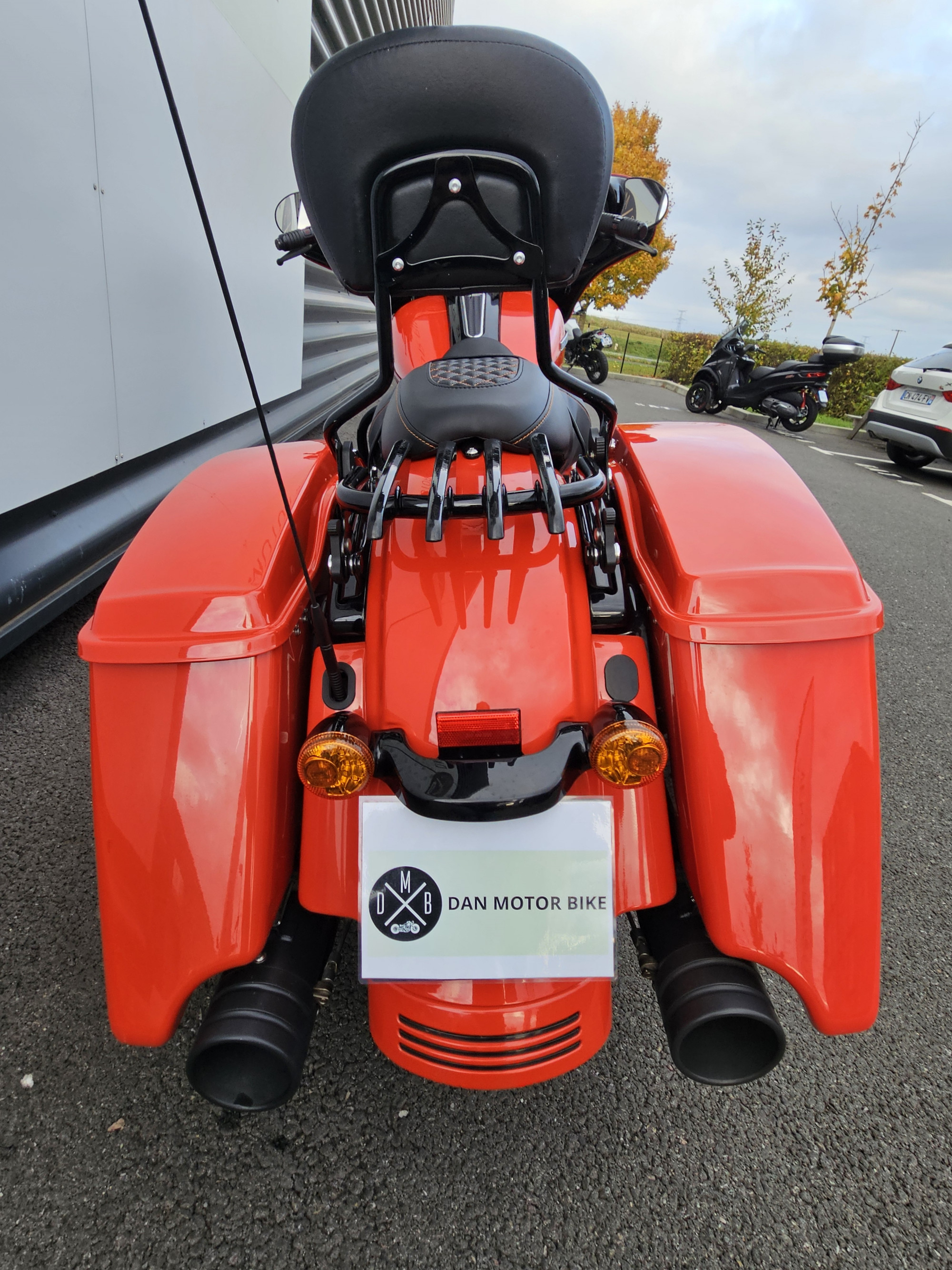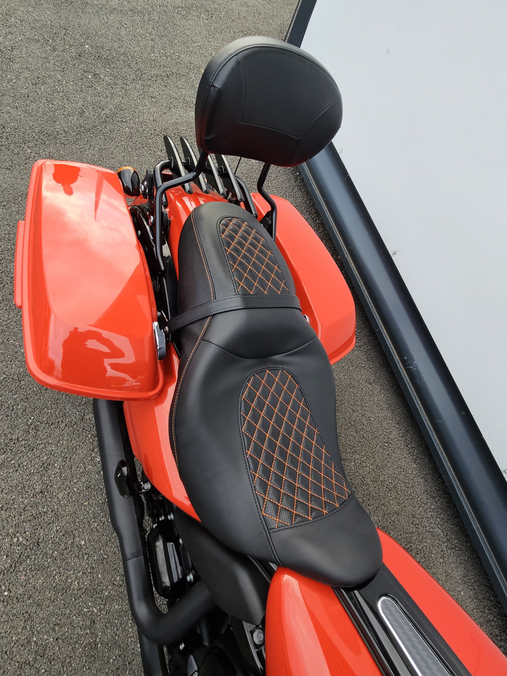 Selle avec coutures orange , sissy bar avec porte paquet amovible .