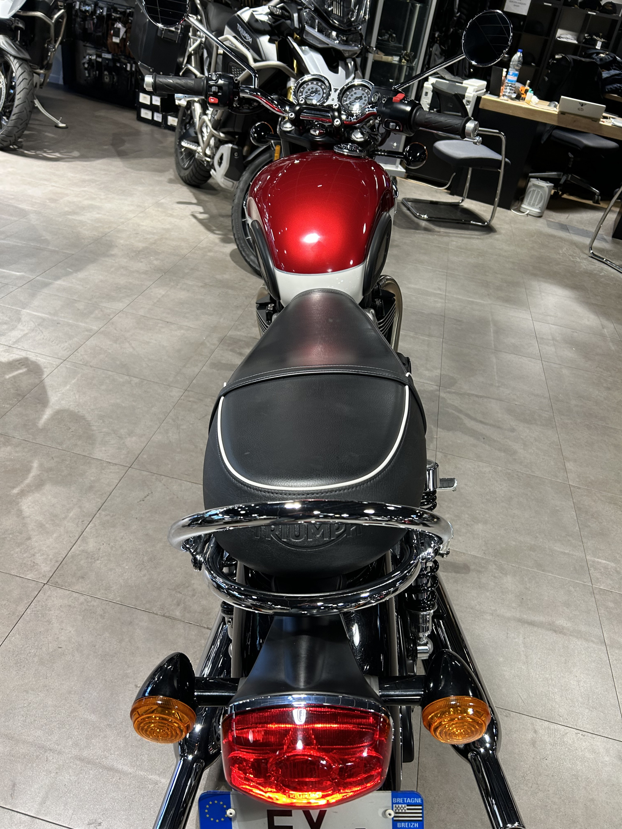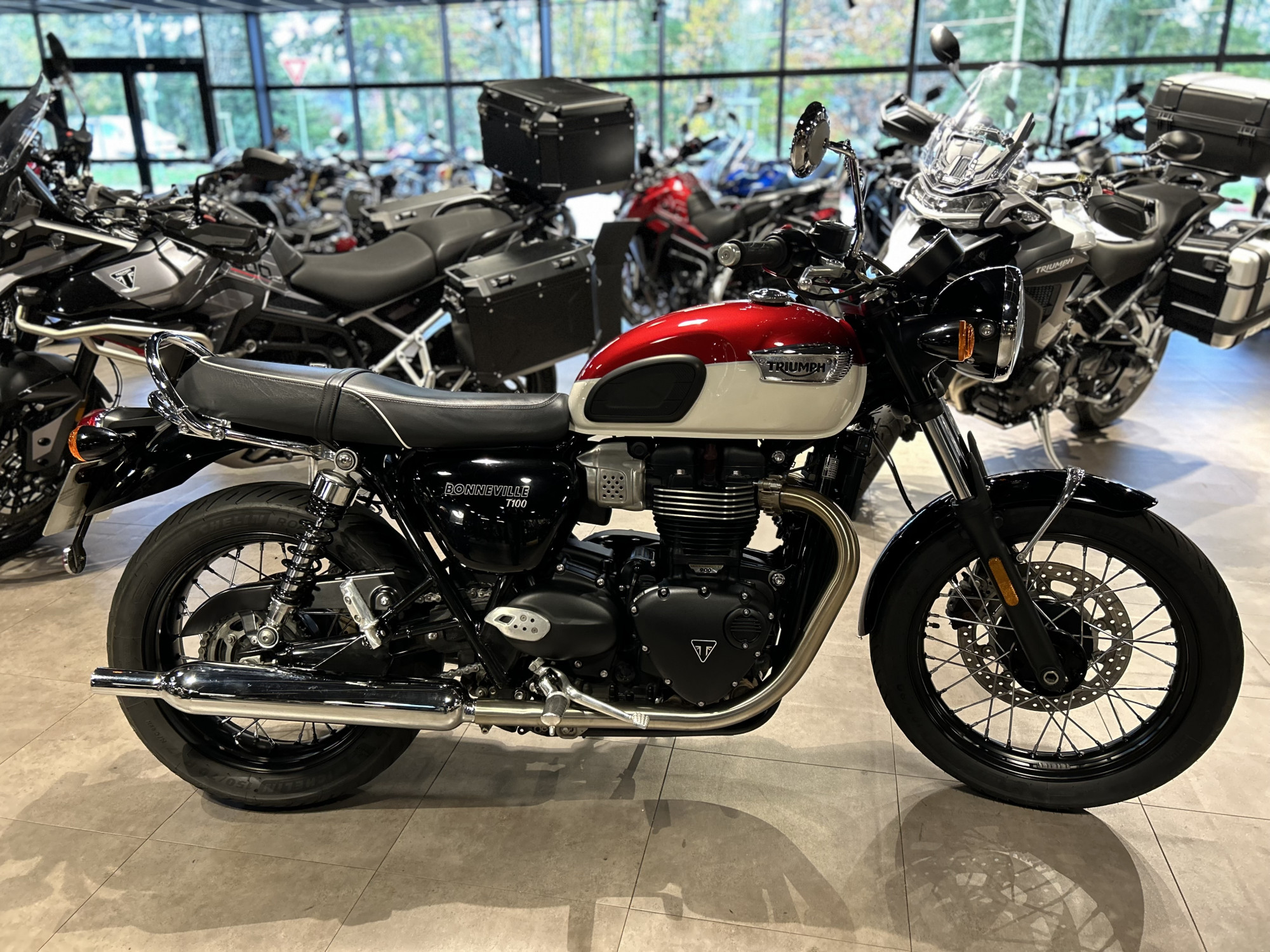 TRES BELLE BONNEVILLE 900 T100 BICOLORE "CARNIVAL RED / FUSION WHITE" - ELIGIBLE PERMIS A2 - HISTORIQUE COMPLET TRIUMPH - ENTRETIEN COMPLET 10/2025 - OPTIONS GRABRAIL ET POIGNEE PASSAGER CHROMEE - GARANTIE 12 MOIS - AUCUN FRAIS A PREVOIR