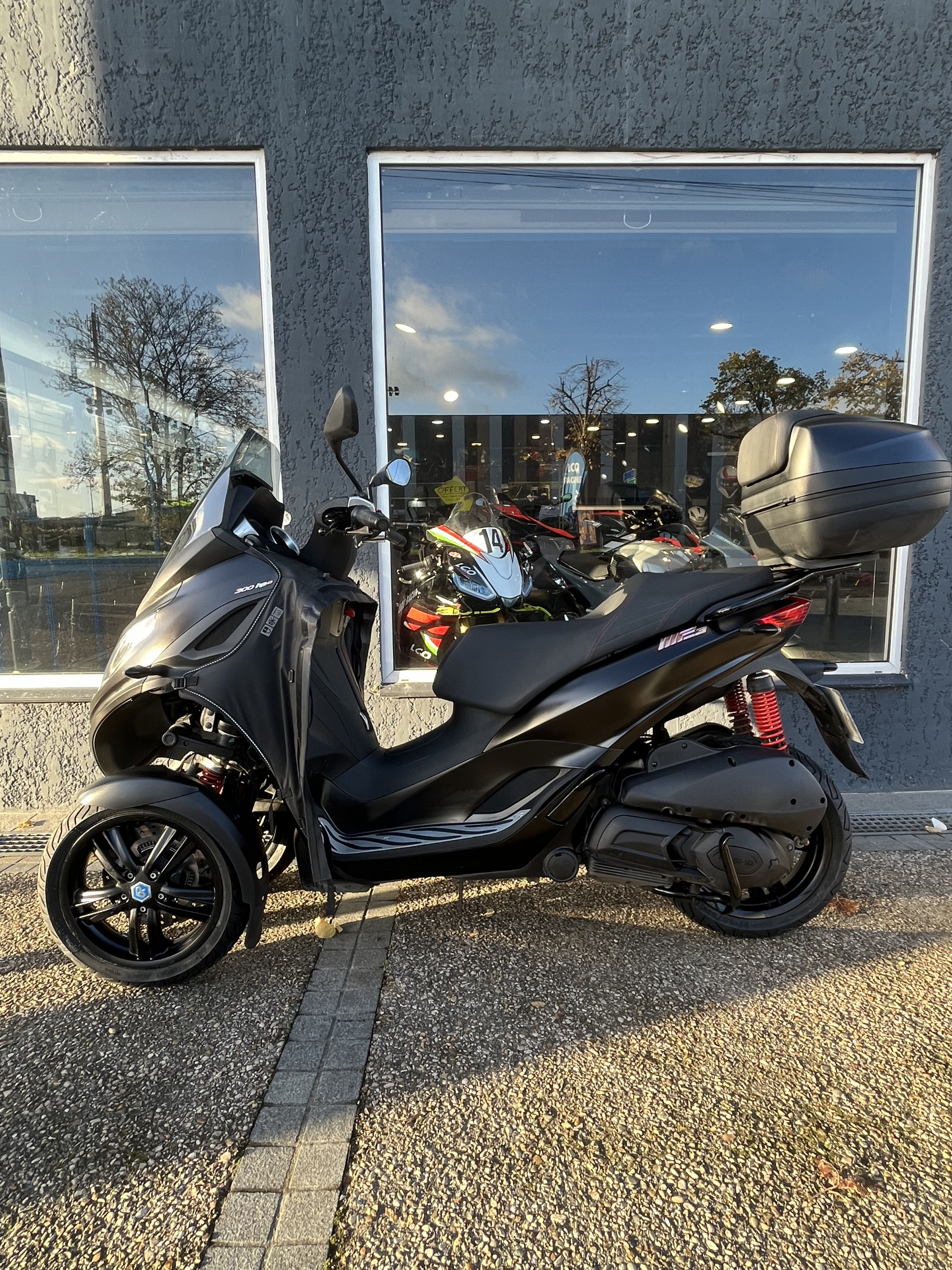 Accessoires inclus : top case et tablier installés sur le scooter.