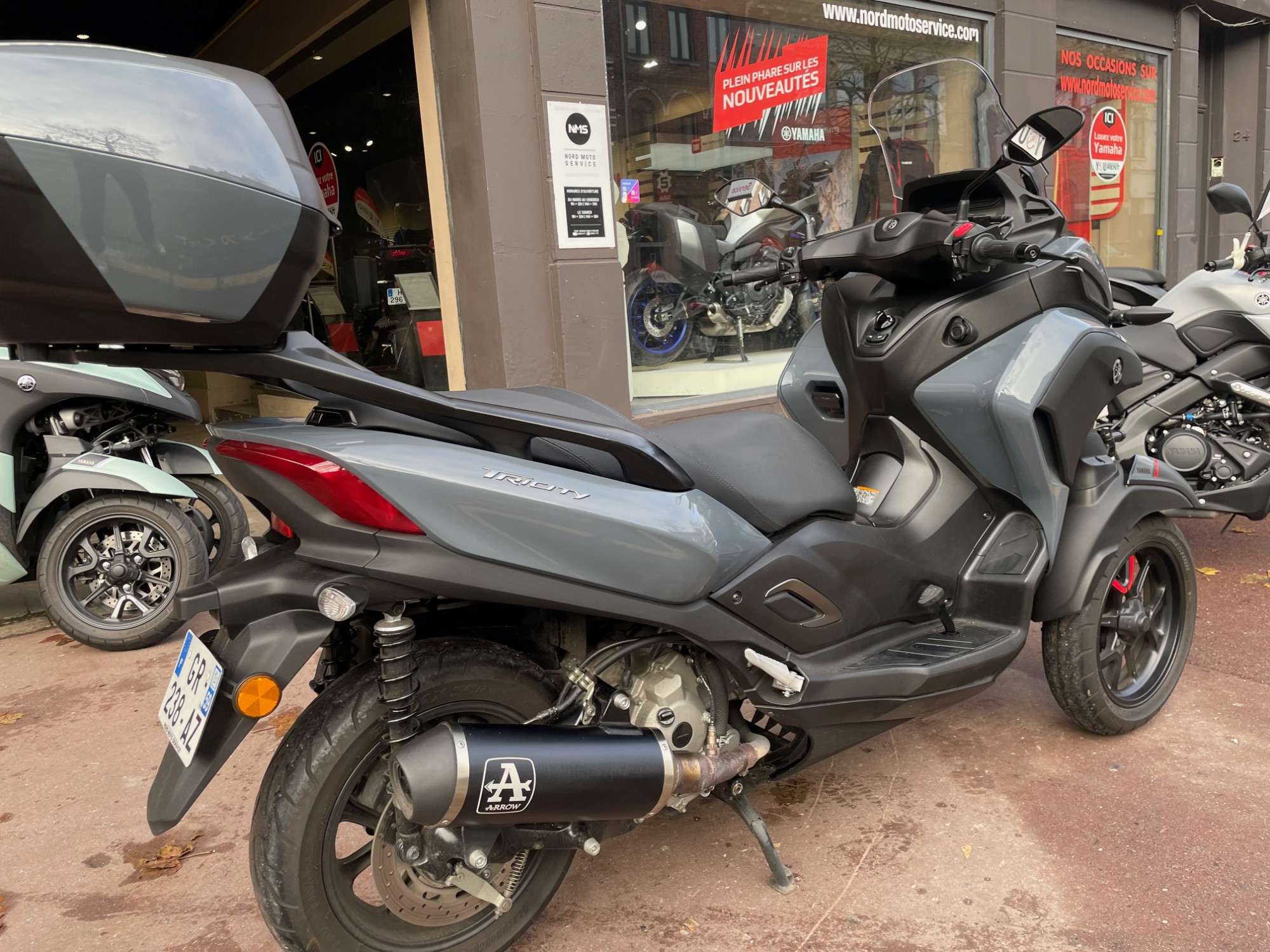 Il est équipé du top case 2 casques et du silencieux Arrow.