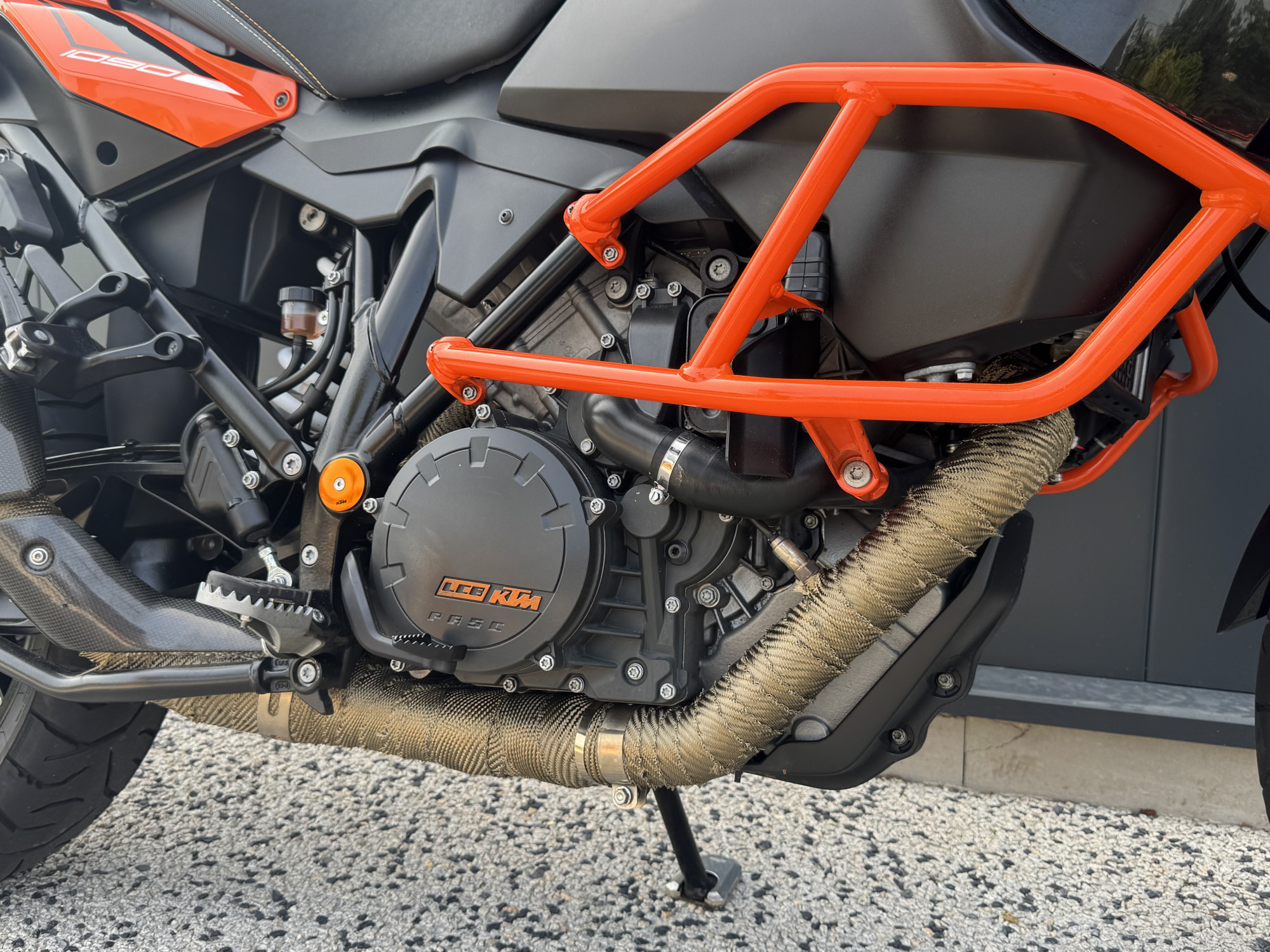 Elle est équipée d'une selle confort sur-mesure, crash-bar, silencieux AKRAPOVIC, bulle teinté, support de valise KTM.